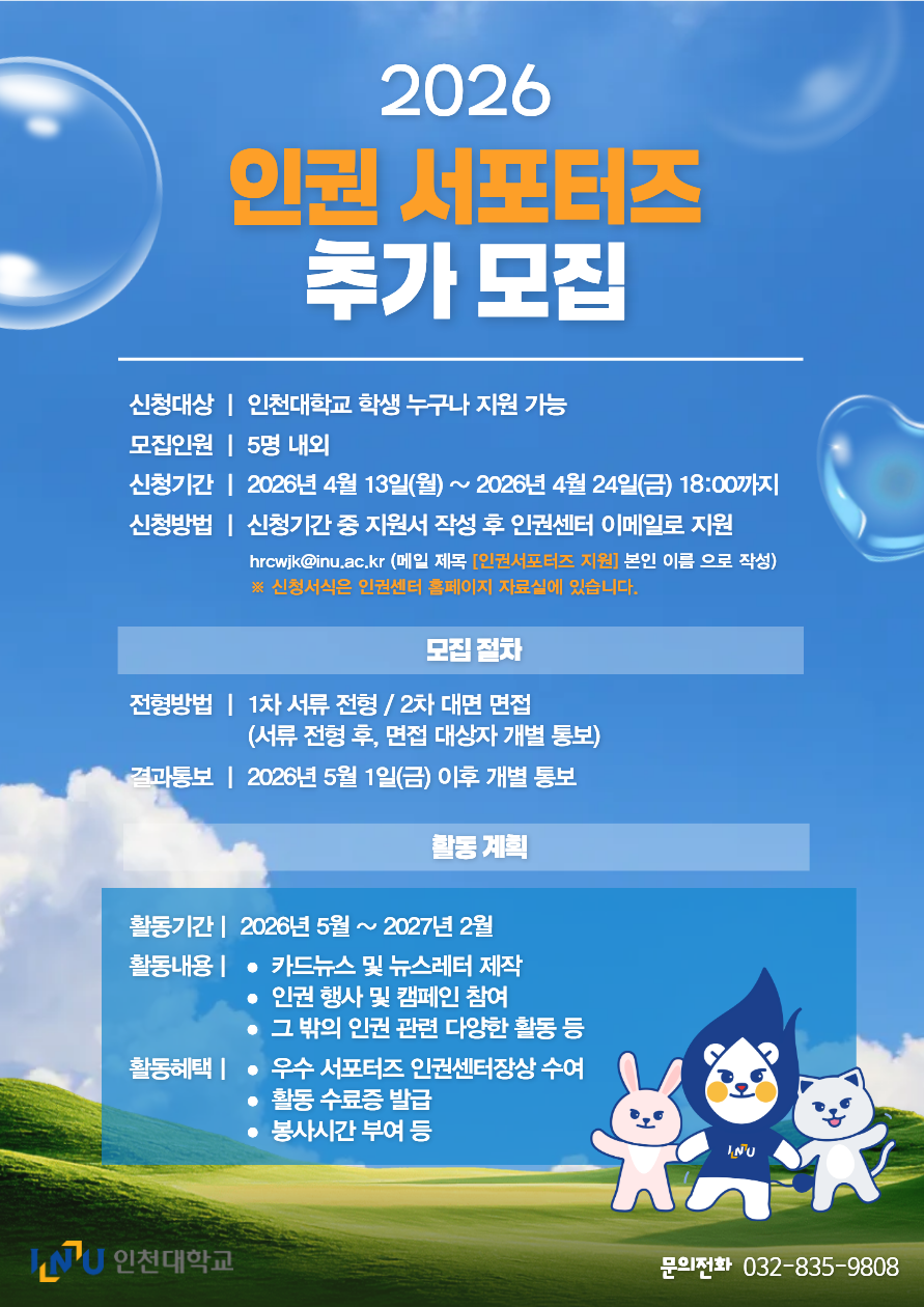 fnctId=bbs,fnctNo=2769 [INU인권센터] 2026 인권서포터즈 추가 모집 안내 (~4/24) 글번호 422687 작성일 2026-04-10 수정일 2026-04-10 작성자 INU인권센터 (032-835-9808) 조회수 201 2026 인권서포터즈를 추가 모집하고 있습니다. 학생 여러분의 많은 관심과 지원 바랍니다! 첨부파일 [붙임1] 인권서포터즈 지원서.hwp 목록